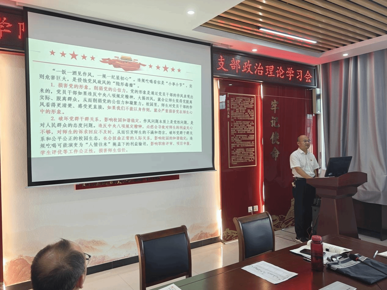 岳文闻给大家上了一堂以《深入贯彻中央八项规定精神 自觉抵制违规吃喝》为主题的党课,号召全体教师深刻认识违规吃喝的危害,自觉抵制不正之风,增强遵规守纪的自觉性。他指出,要进一步强化教师的规矩意识和纪律意识,为作风建设常态化奠定了基础。广大党员要持之以恒贯彻落实中央八项规定精神,以清正党风带动淳朴民风,以优良作风引领时代新风。