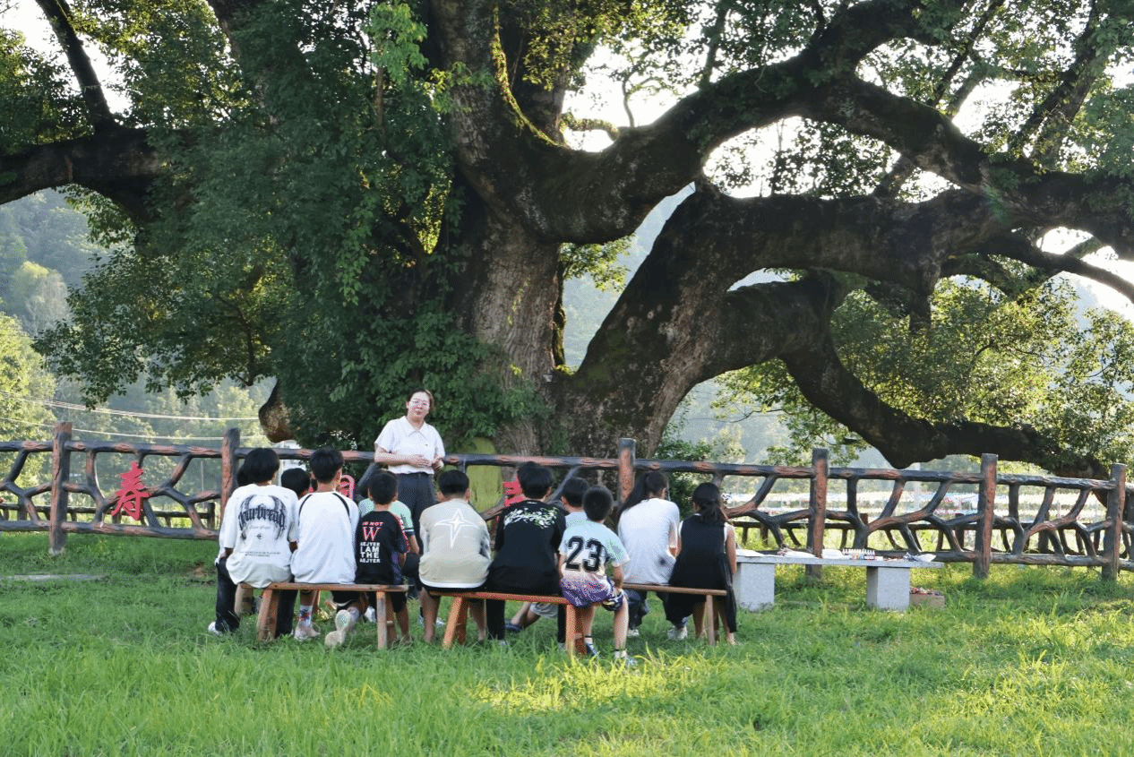 村头古老的香樟树下,浓荫蔽日,蝉鸣阵阵。实践队指导老师将课堂搬到了大自然中。一堂以“绿水青山就是金山银山”为主题的生态环保课在熟悉的家乡风光中展开。通过结合东浒村周边的青山绿水、田园风光等熟悉场景,引导孩子们思考家乡的美丽山水从何而来、如何守护,教育大家从小树立环保意识。“不能乱扔垃圾!”“要爱护小鸟和小树!”“洗手的时候水龙头要开小一点!”孩子们用稚嫩却坚定的声音,表达着守护家乡“金山银山”的决心。这堂在大自然怀抱中的课堂,将绿色的理念深深根植于孩子们心间。