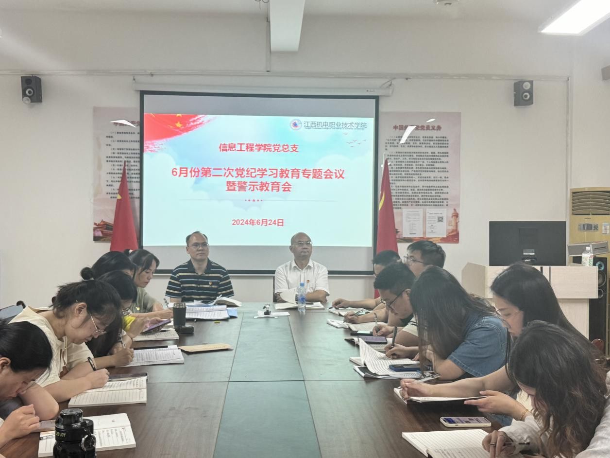 6月24日,XC体育召开党纪学习教育专题会议暨警示教育会,会议由教师党支部书记吴丽华主持,定点联系分院校领导岳文闻、党总支书记黄素玲、分院经理万嵩,分院全体党员参加此次会议。
