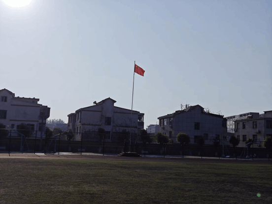 升旗仪式开始。国旗护卫队迈着整齐划一、铿锵有力的步伐,护卫着鲜艳的五星红旗入场,伴随着雄壮的国歌,五星红旗冉冉升起,迎风飘扬。全体师生庄严肃立,向国旗行注目礼。