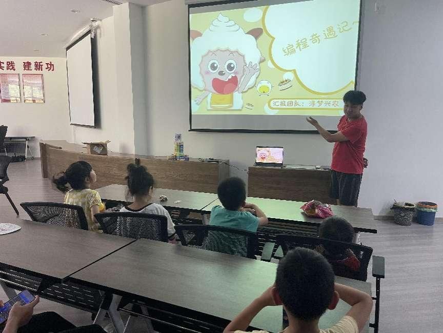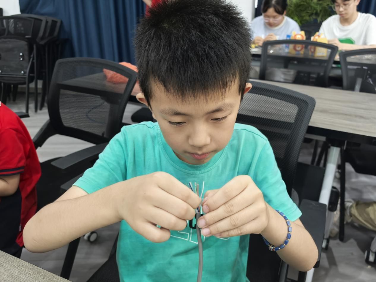 在金盘村党群服务中心,实践队员们根据所学专业精心准备了一堂别开生面的“职业体验课”。课堂上,队员们用生动的语言和有趣的互动方式,向孩子们介绍了少儿编程的基础知识,并通过简单的编程游戏和实例,锻炼孩子们的逻辑思维和问题解决能力,激发了他们对科技探索的热情和创造力。此外,网线制作课程也进行得如火如荼。实践队员们耐心地向孩子们讲解网线的结构、种类以及制作步骤,并亲自示范如何剥线、排序、压接水晶头等关键步骤。在队员们的指导下,孩子们小心翼翼地操作着工具,亲手制作出了属于自己的网线。
