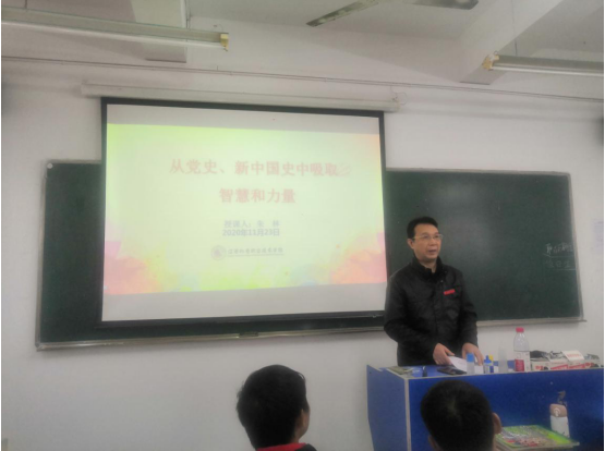 2020年11月23日上午,公司副董事长朱林,深入所指导的20视觉2班,为全体员工讲授了“从党史、新中国史中汲取智慧和力量”专题党课。党课在第二教学楼401教室进行。