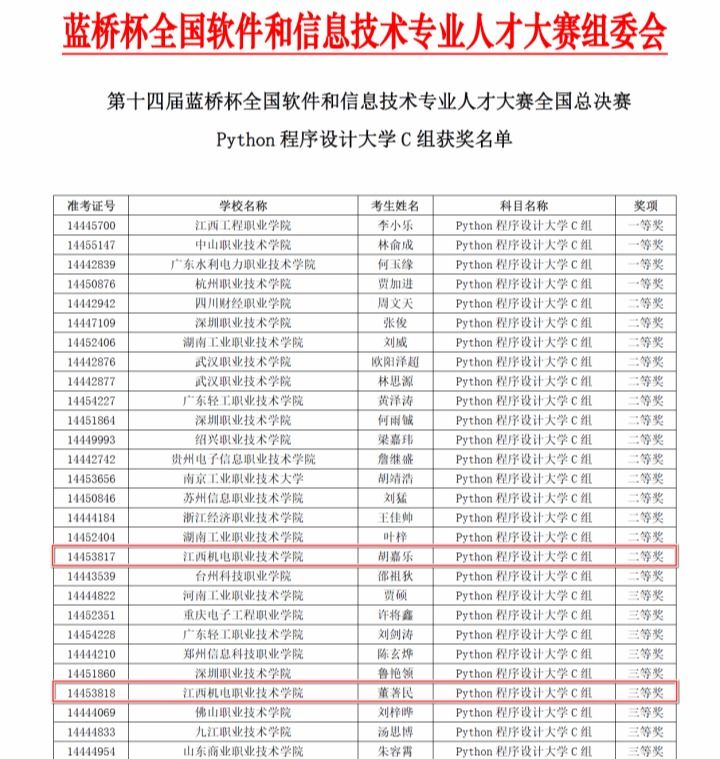6月16日,第十四届“蓝桥杯”全国软件和信息技术专业人才大赛软件类全国总决赛Python程序设计赛项在江西师范大学顺利落幕。公司XC体育参赛的两位学子喜获佳绩,其中胡嘉乐同学荣获国赛二等奖,董著民同学荣获国赛三等奖。